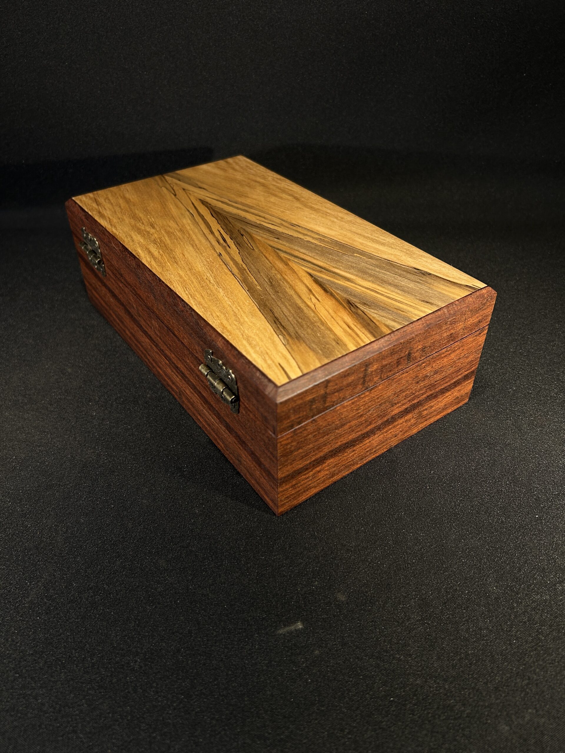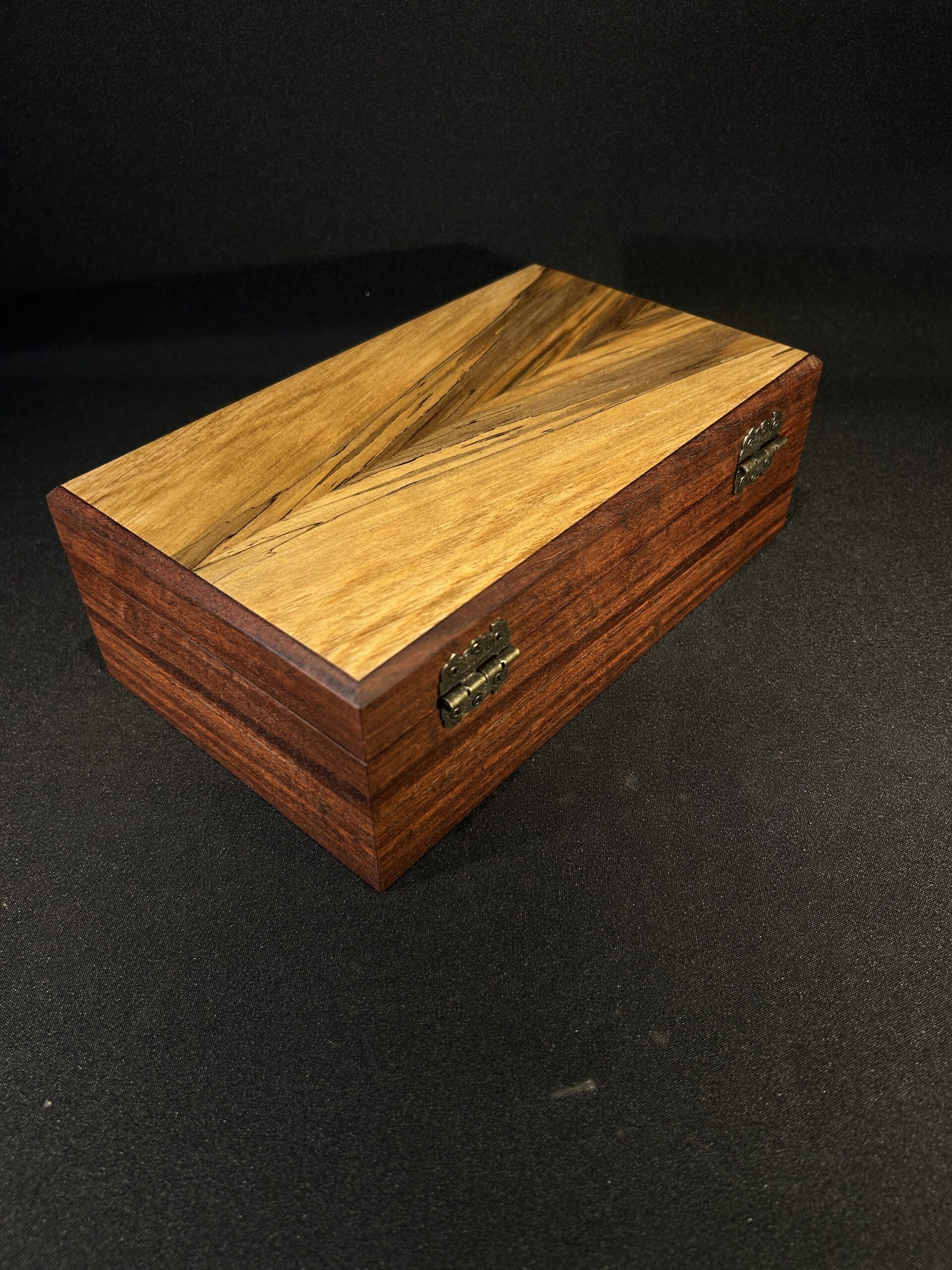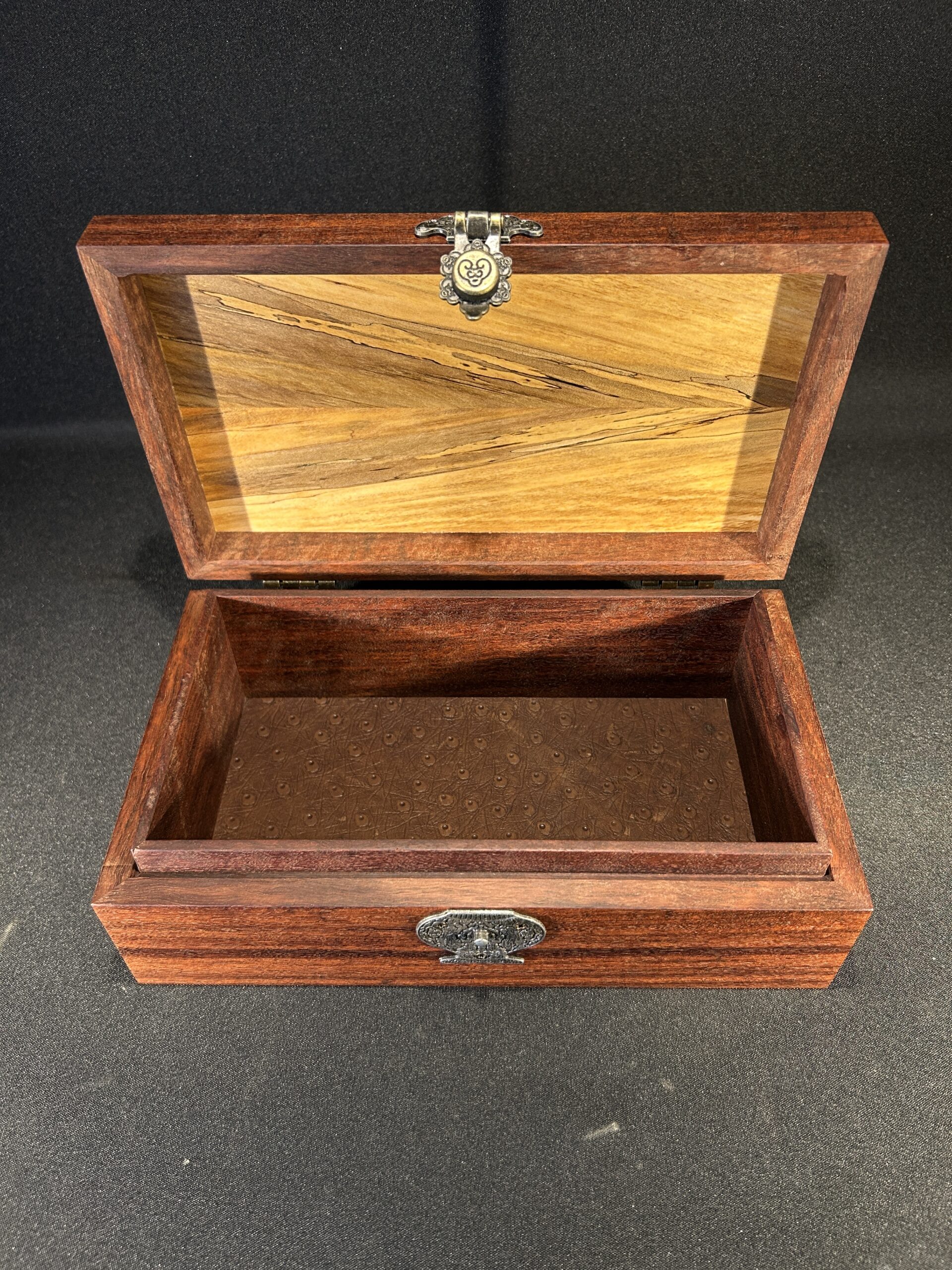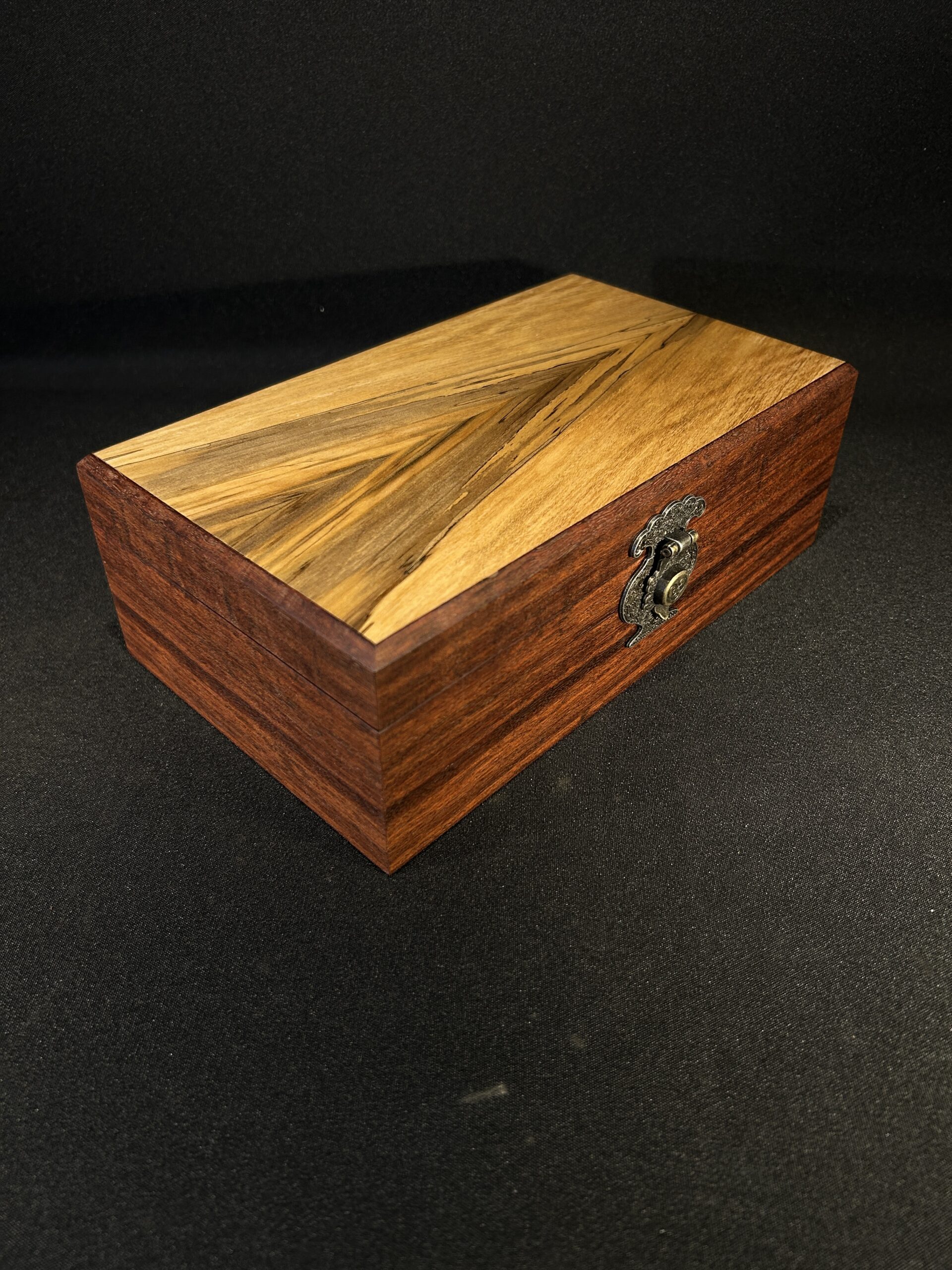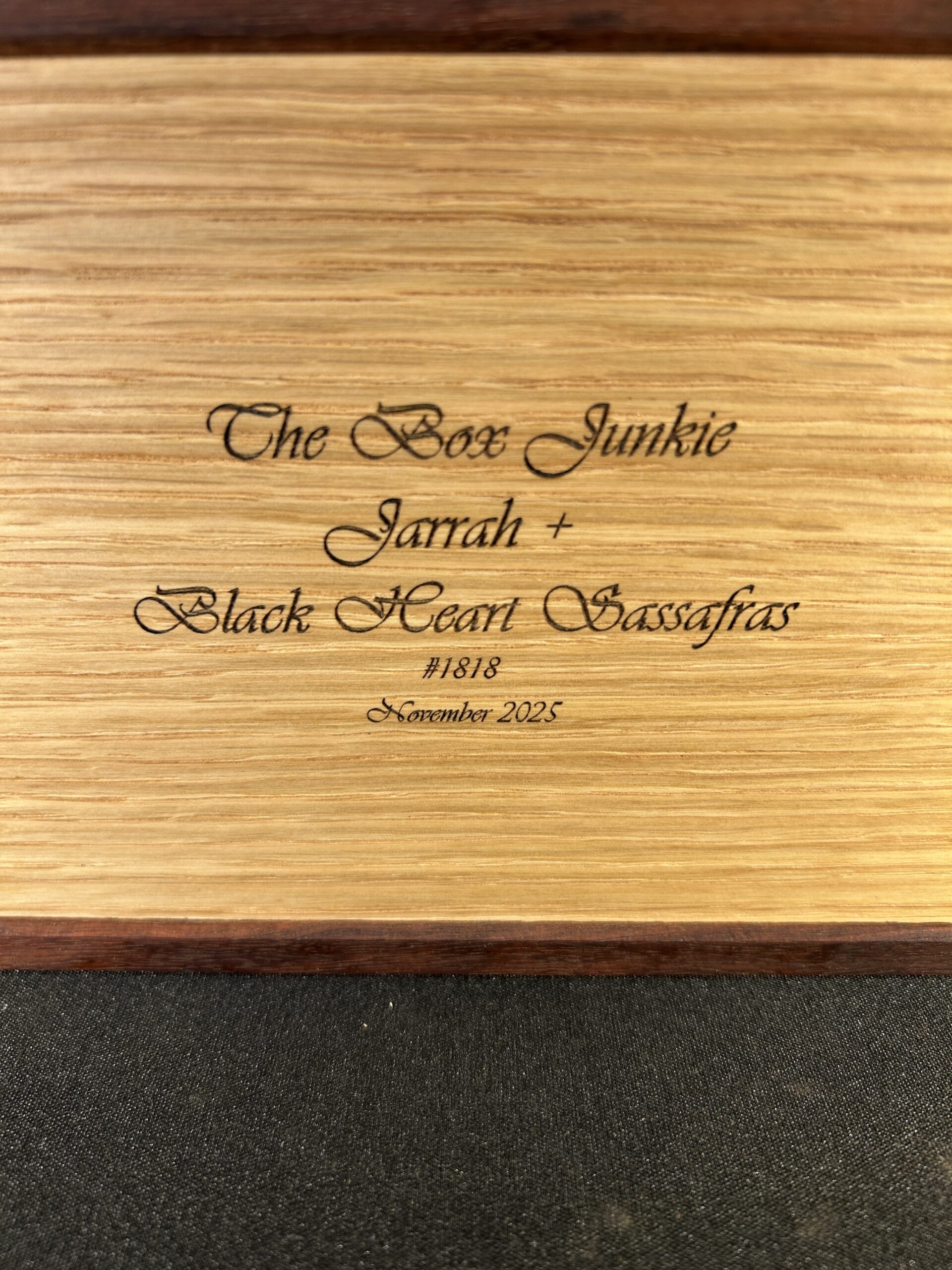 The striking grain pattern and markings of the book matched Black Heart Sassafras make a stark contrast to the deep Brown and Black of the West Australian Jarrah. This box is ideal for jewellery, keepsake and every day items while the metal hinges and press stud clasp blend with the Grey’s in the Sassafras. The timbers are finished with Constantia Organic Finishes oils and waxes.