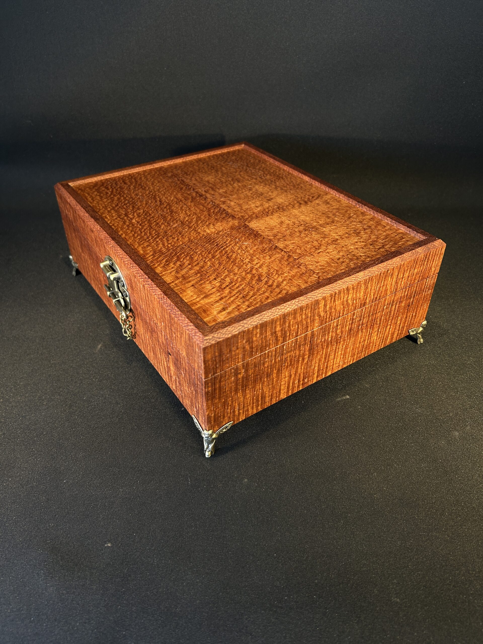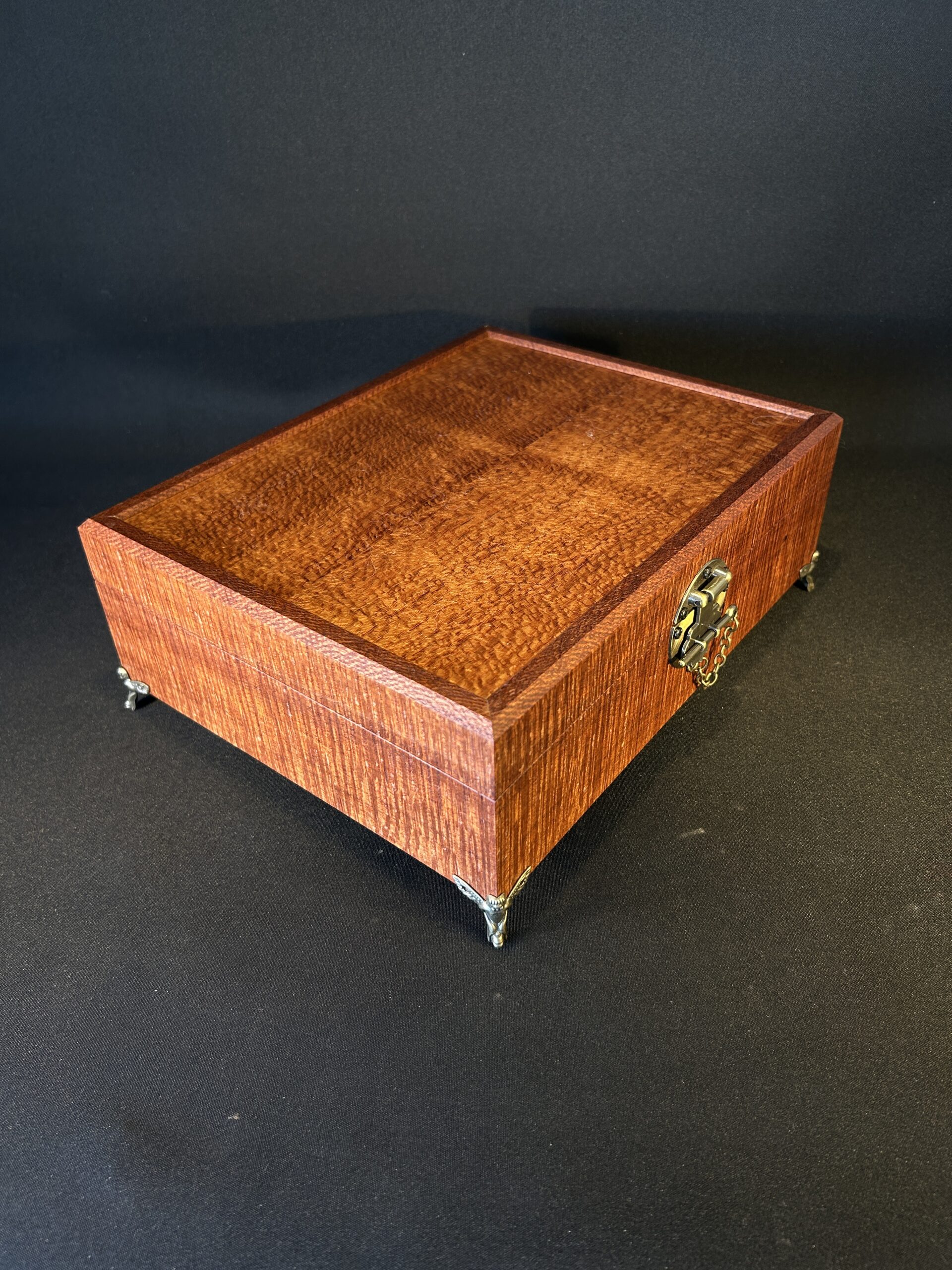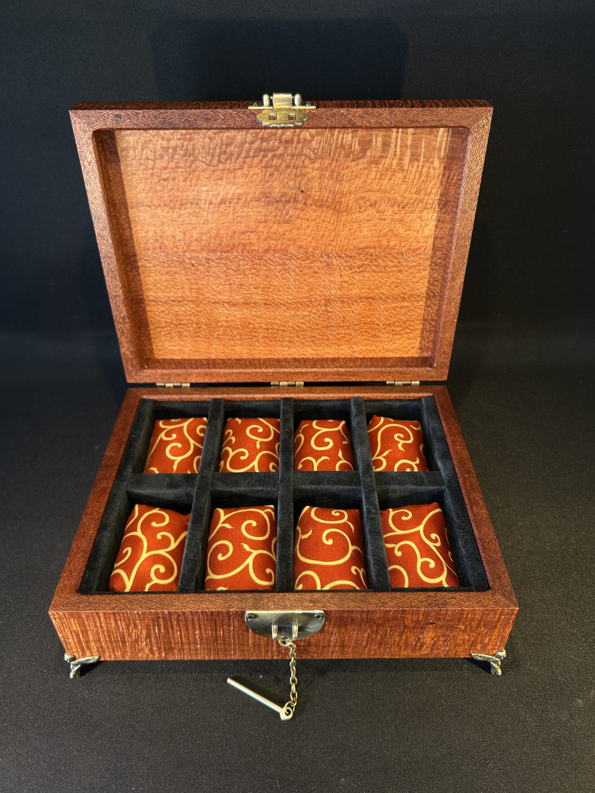 Beefwood when quarter sawn produces some of the loveliest grain patterns of all timbers and this one is a stunning example. This box for 8 watches is a luxury item with a touch of the Orient to add a little mystery. The Black leather linings and vibrant soft Red pillows form a bold statement when the lid is opened. Ideal for all size watches with each bay 85mm x 53mm with ample height for even the thickest watch cases. The beefwood is finished with Constantia Organic Finishes oils and waxes.