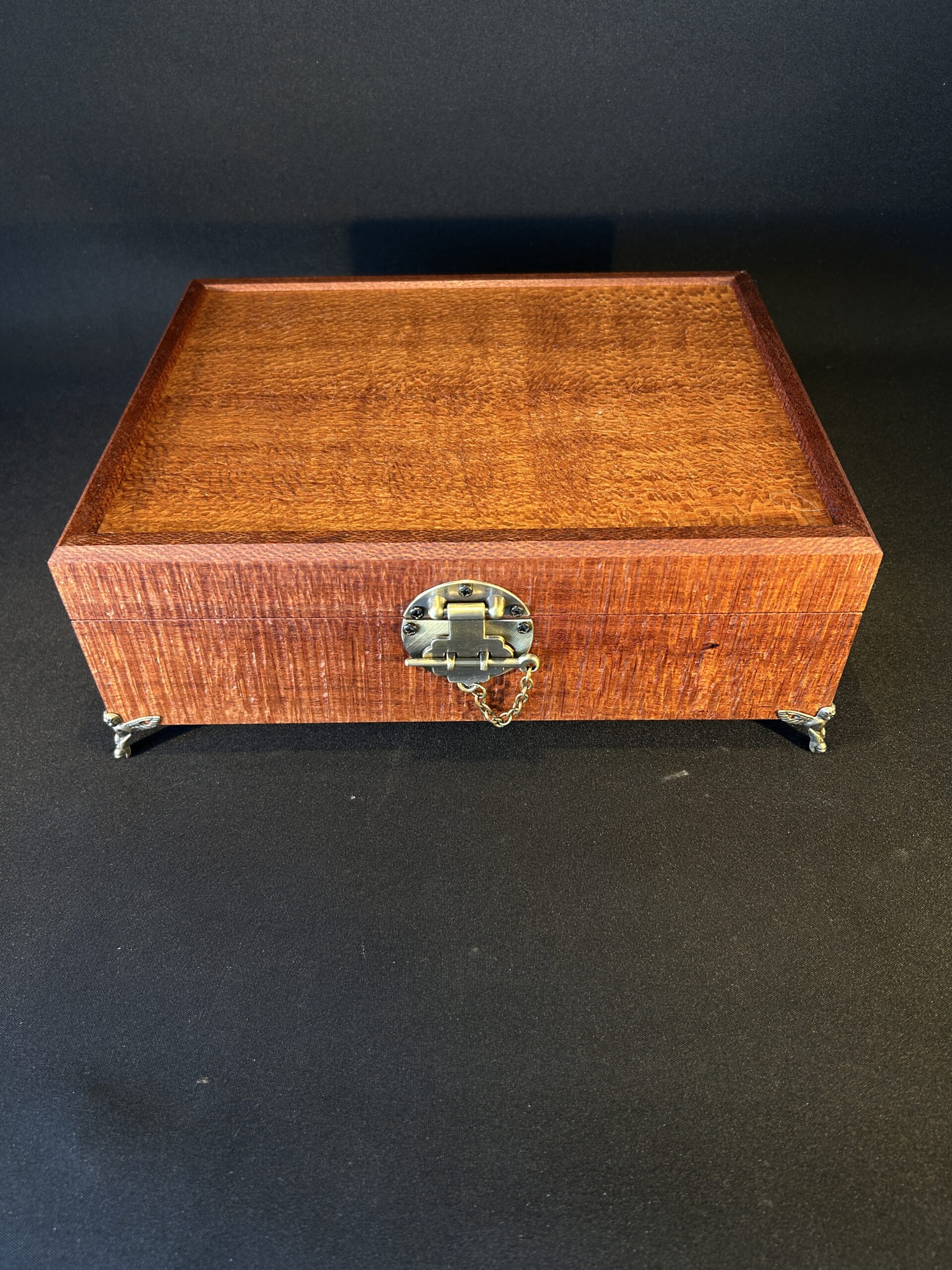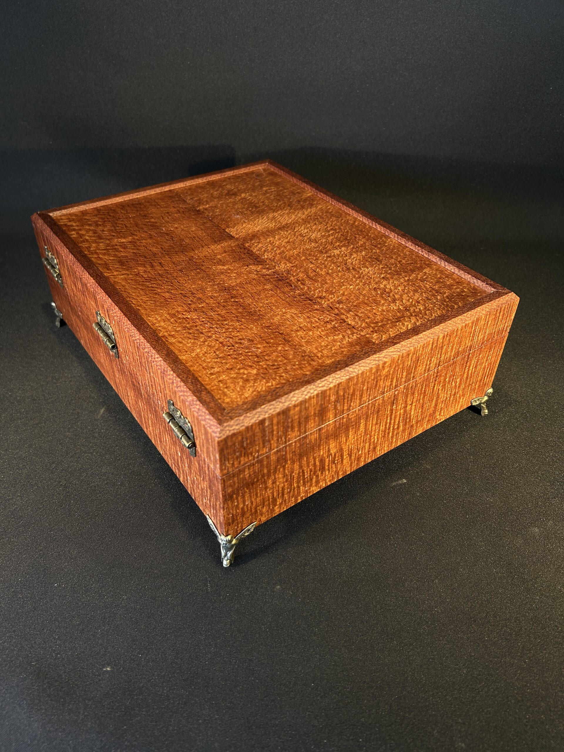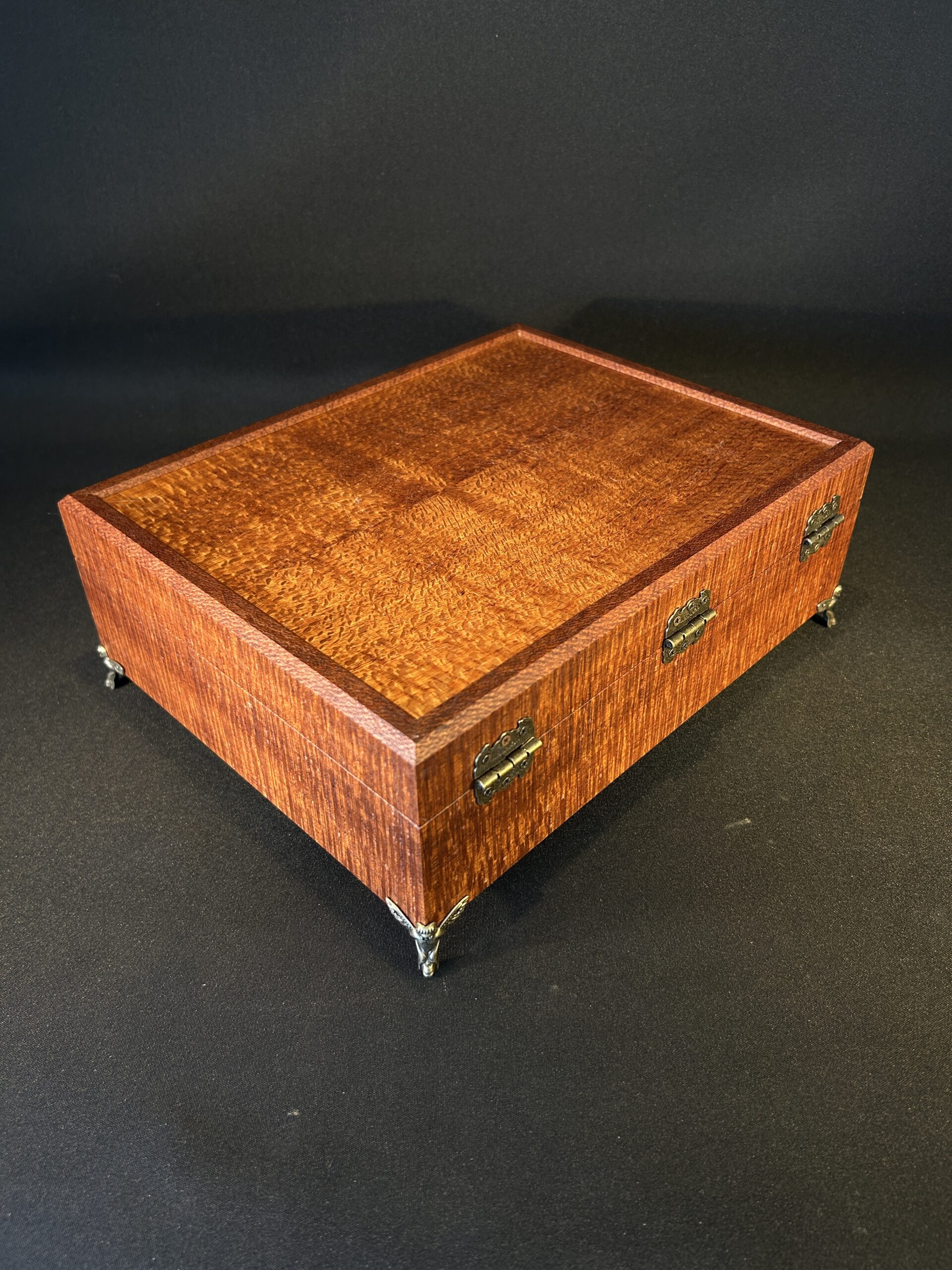 Beefwood when quarter sawn produces some of the loveliest grain patterns of all timbers and this one is a stunning example. This box for 8 watches is a luxury item with a touch of the Orient to add a little mystery. The Black leather linings and vibrant soft Red pillows form a bold statement when the lid is opened. Ideal for all size watches with each bay 85mm x 53mm with ample height for even the thickest watch cases. The beefwood is finished with Constantia Organic Finishes oils and waxes.